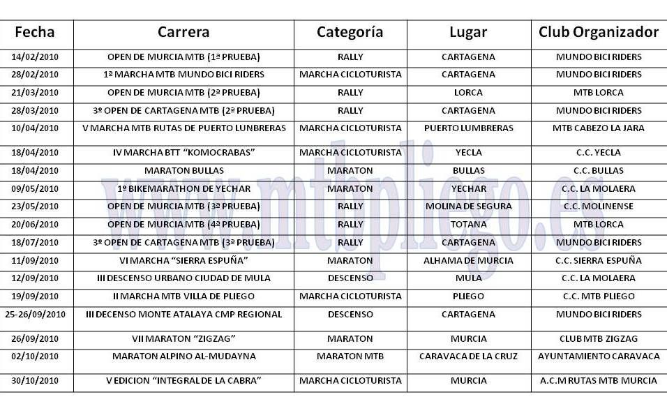 CALENDARIO PRUEBAS MTB/BTT MURCIA 2010
