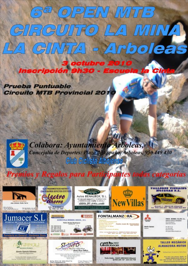ESTA CARRERA ESTA ORGANIZADA POR EL AYUNTAMIENTO DE ARBOLEAS Y EL C.C. ALBOJENSE, ESTE AÑO LA CARRERA ESTA INCLUIDA DENTRO DEL CIRCUITO PROVINCIAL DE ALMERÍA 2010 (MTB RALLY).